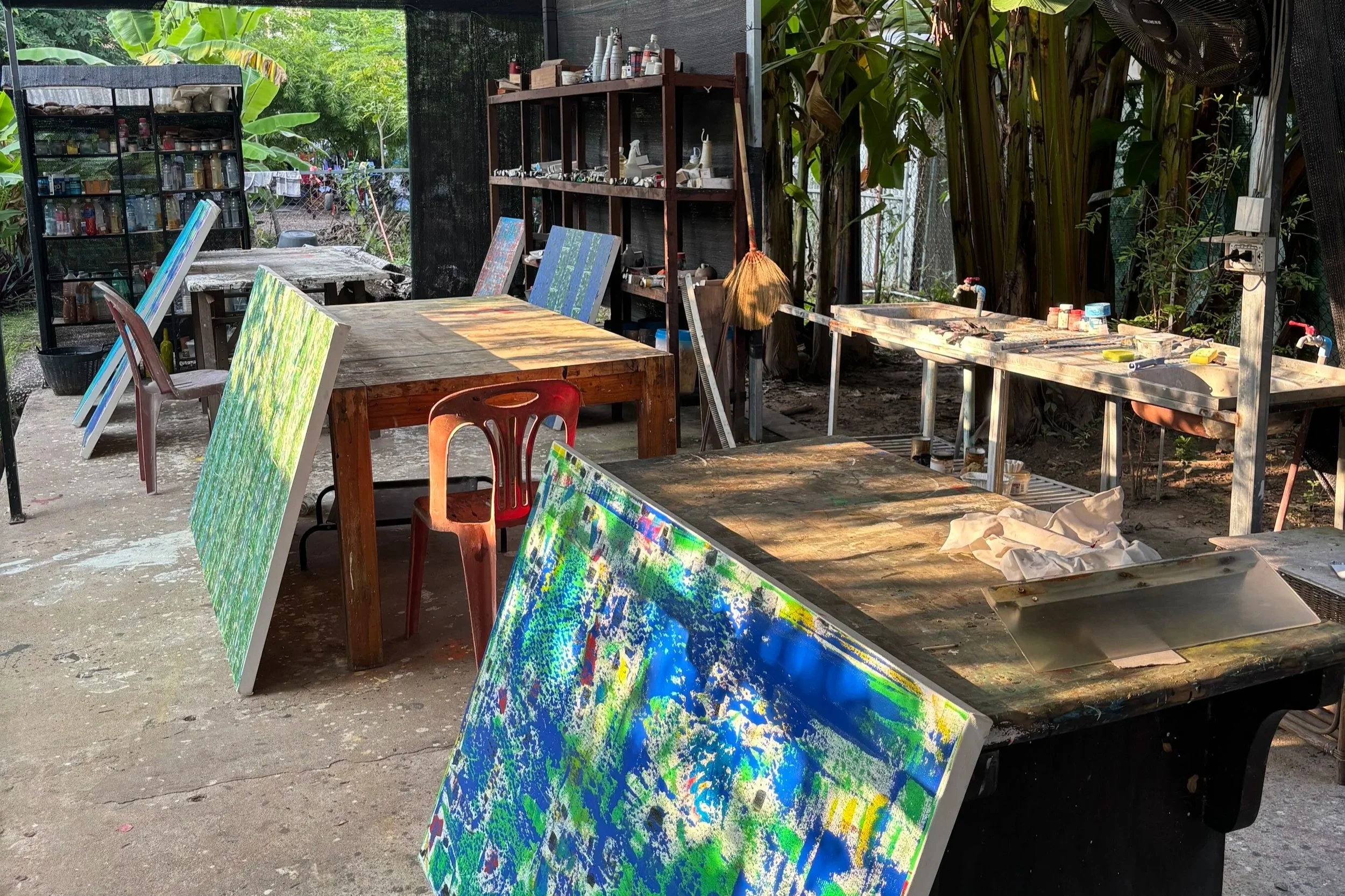Shada’s open-air studio in Vientiane, a space where experimentation and intuition guide each brushstroke, and where every canvas becomes a journey into color, texture, and energy.